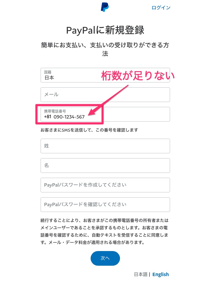 PayPalの新規登録ページで携帯番号を入力の際に桁数が足りなくて入力できない場合があるようです。